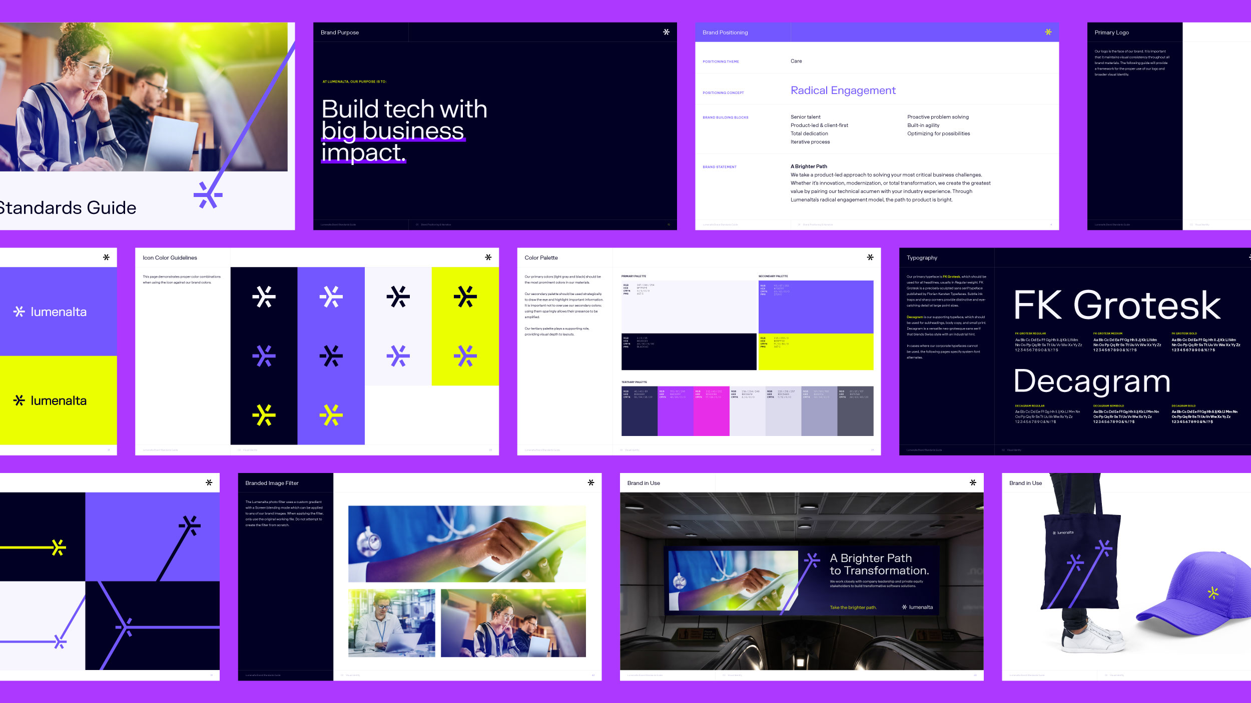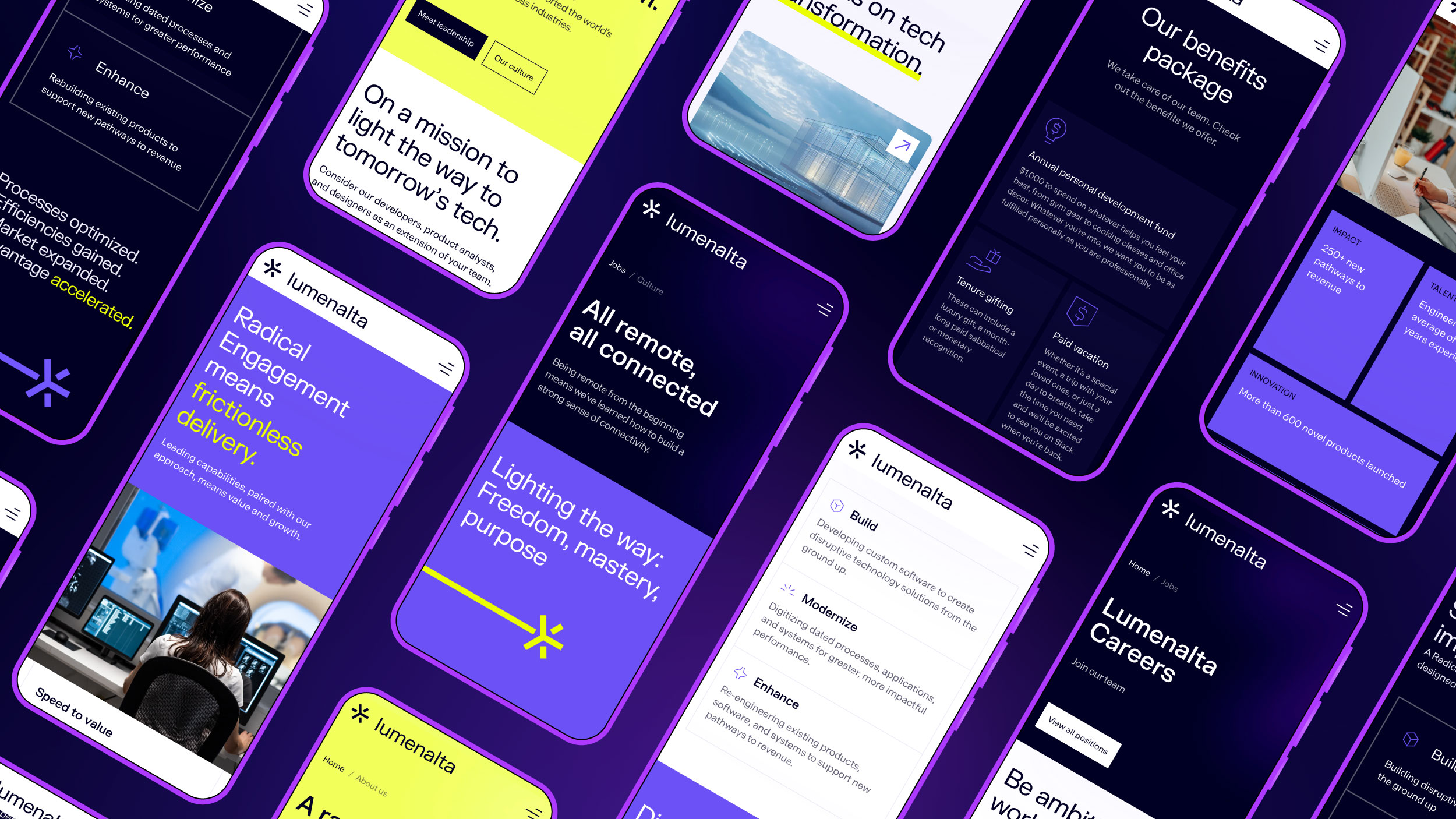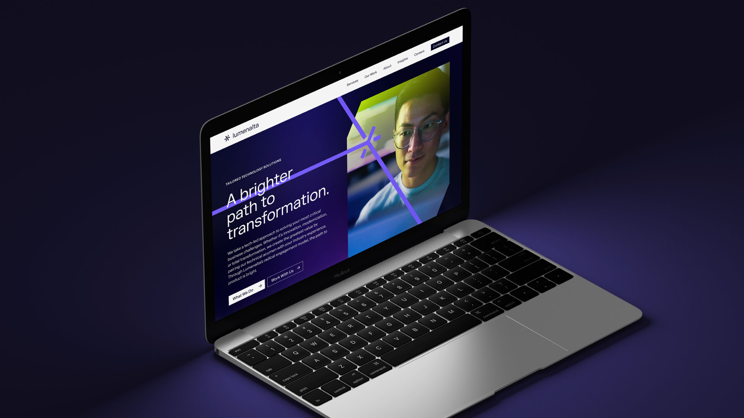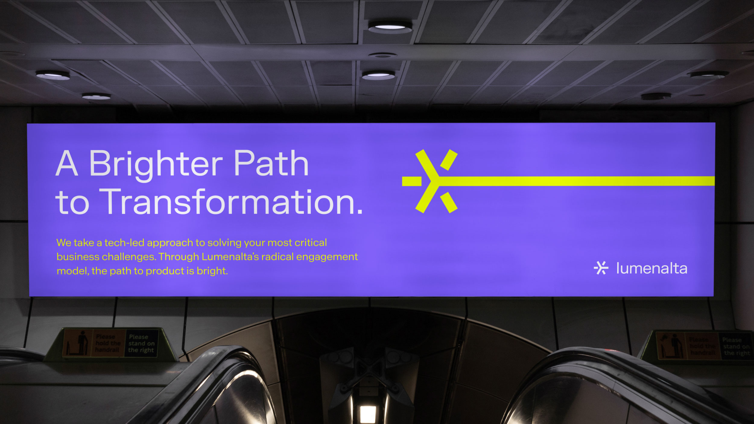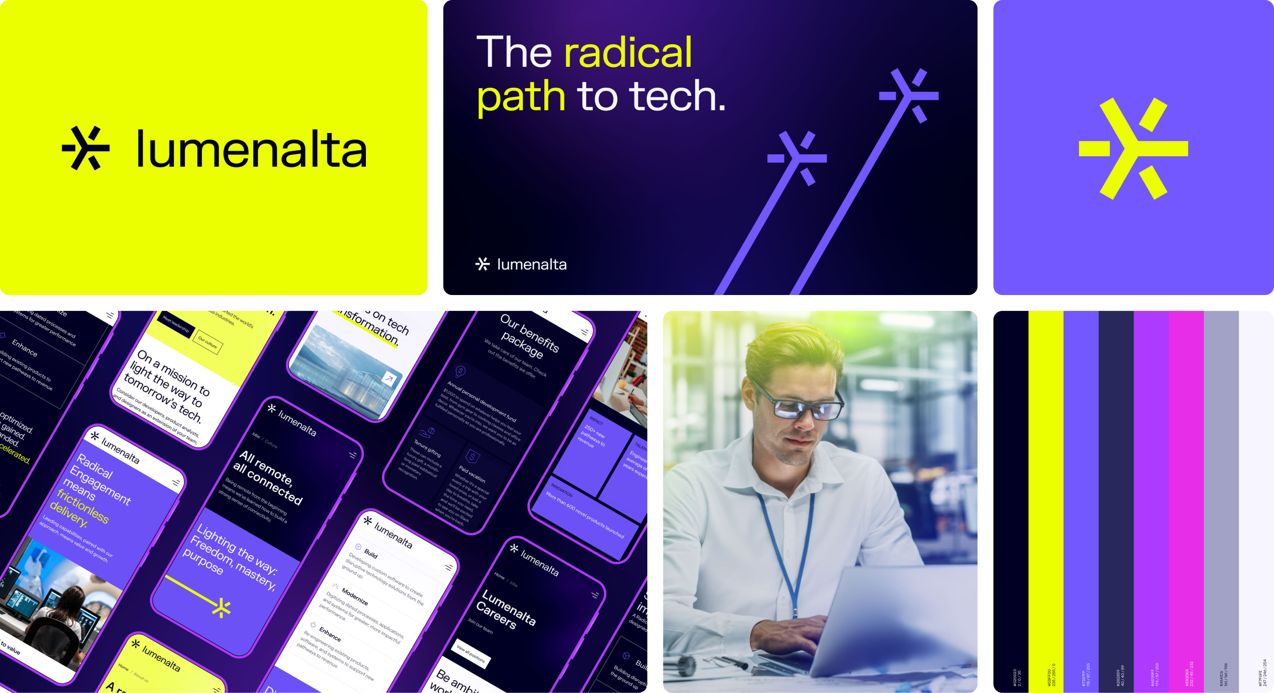 The Lumenalta name combines Latin roots for “light” and “high”—delivering a brighter, higher path to product. While competitors veer into playfulness or corporate restraint, Lumenalta’s identity is bright, professional, and focused. The icon’s extending lines represent possible paths to product, reinforcing quick and agile delivery.
