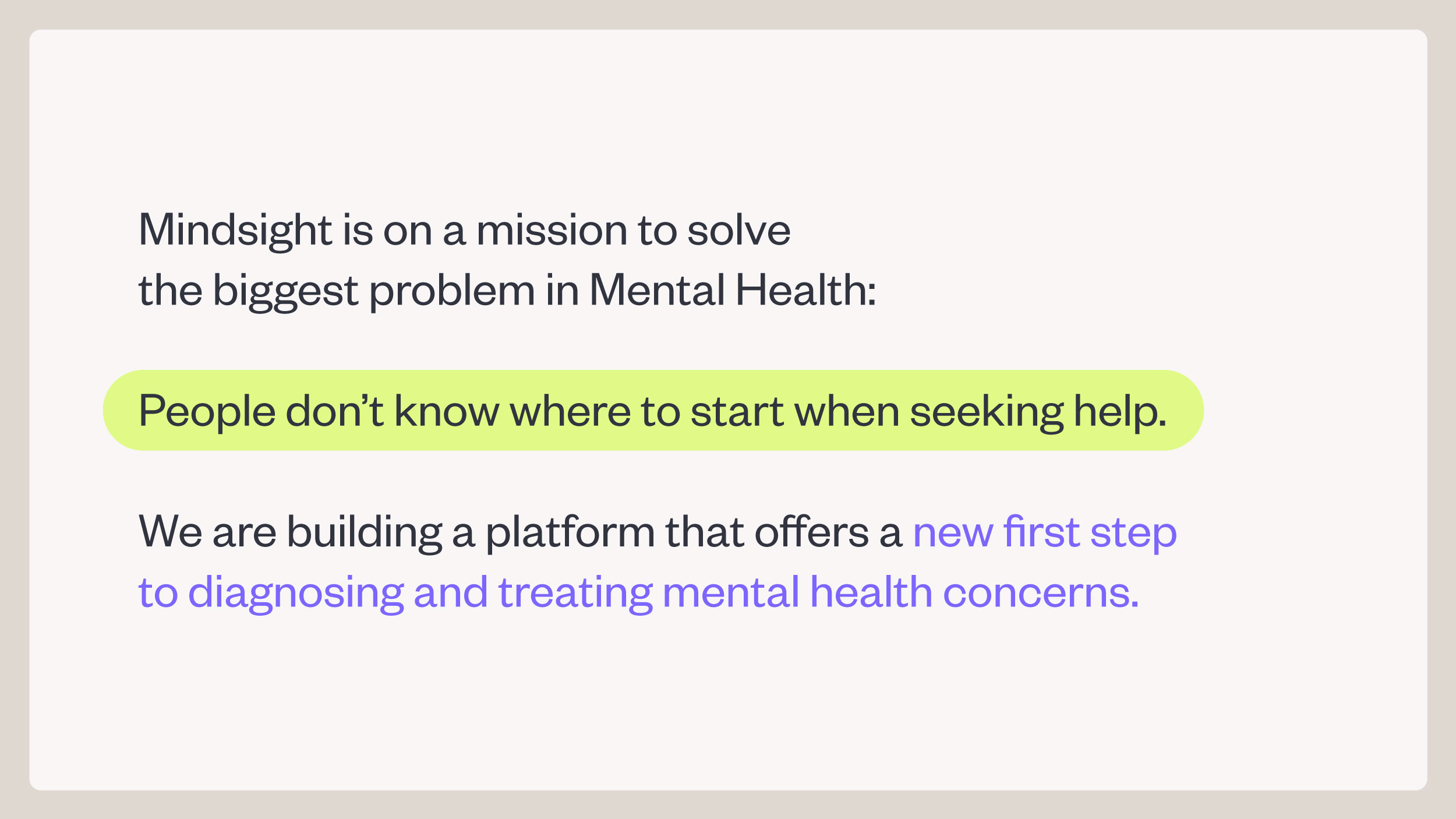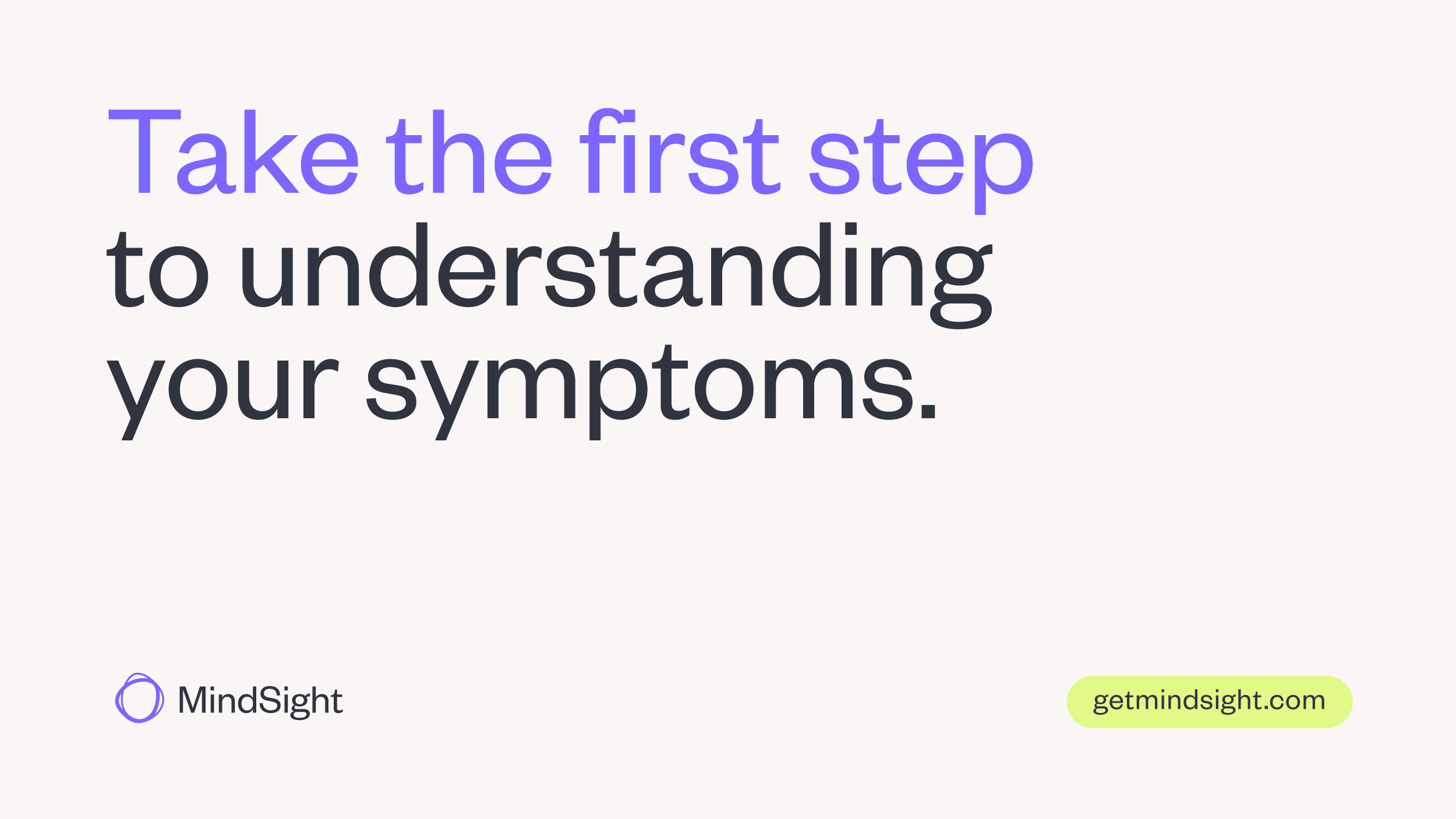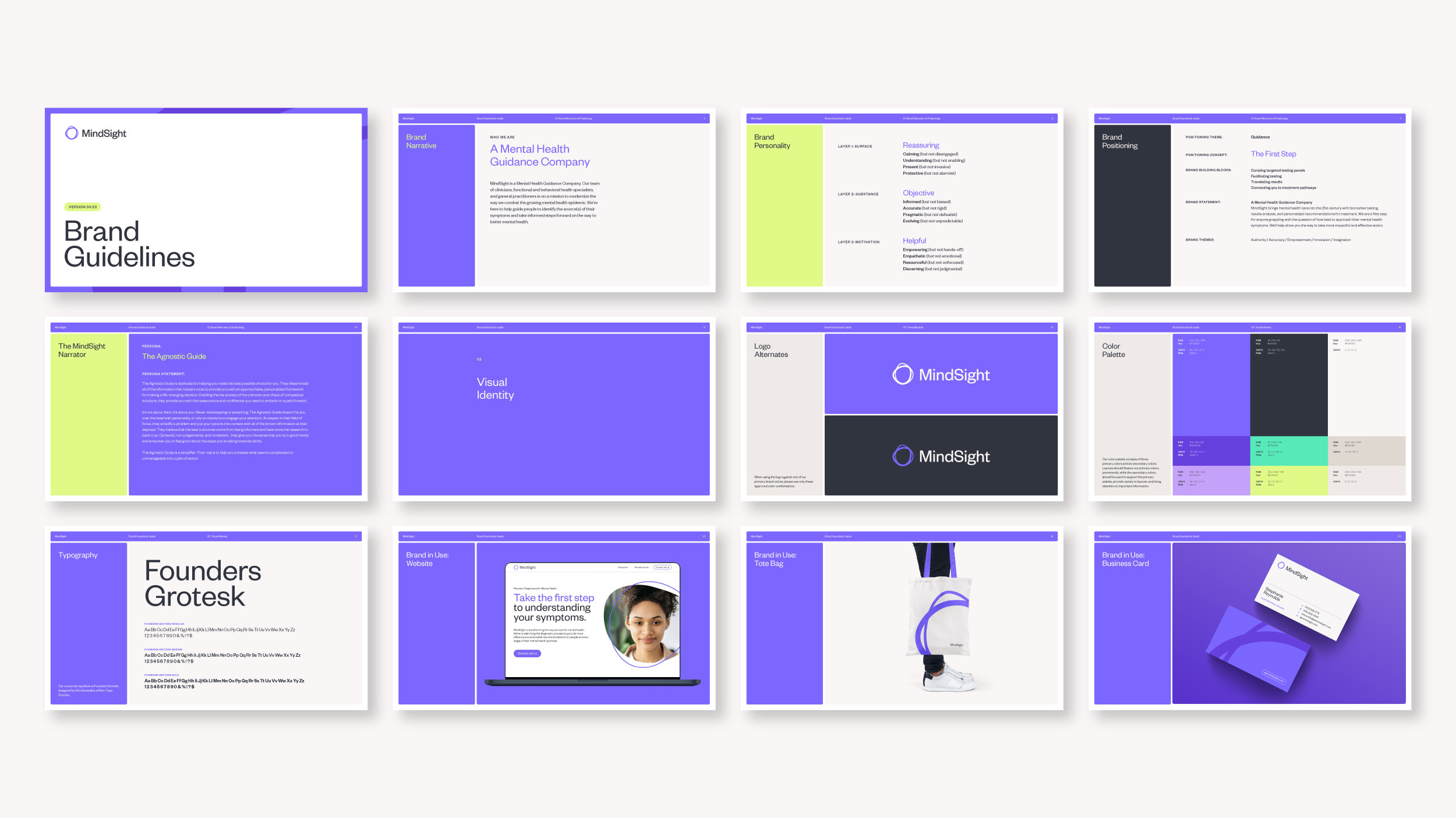 With a better understanding of our market destination, we began the naming process. We created the compound of Mind + Sight to clearly embody both the process and the end result. Next, we built the basic brand narrative and positioning platform. Targeting our B2C psychographic’s feelings of frustration and confusion around mental health, we structured our brand around a theme of guidance. MindSight became a Mental Health Guidance Company offering a “New First Step” to diagnostic precision.