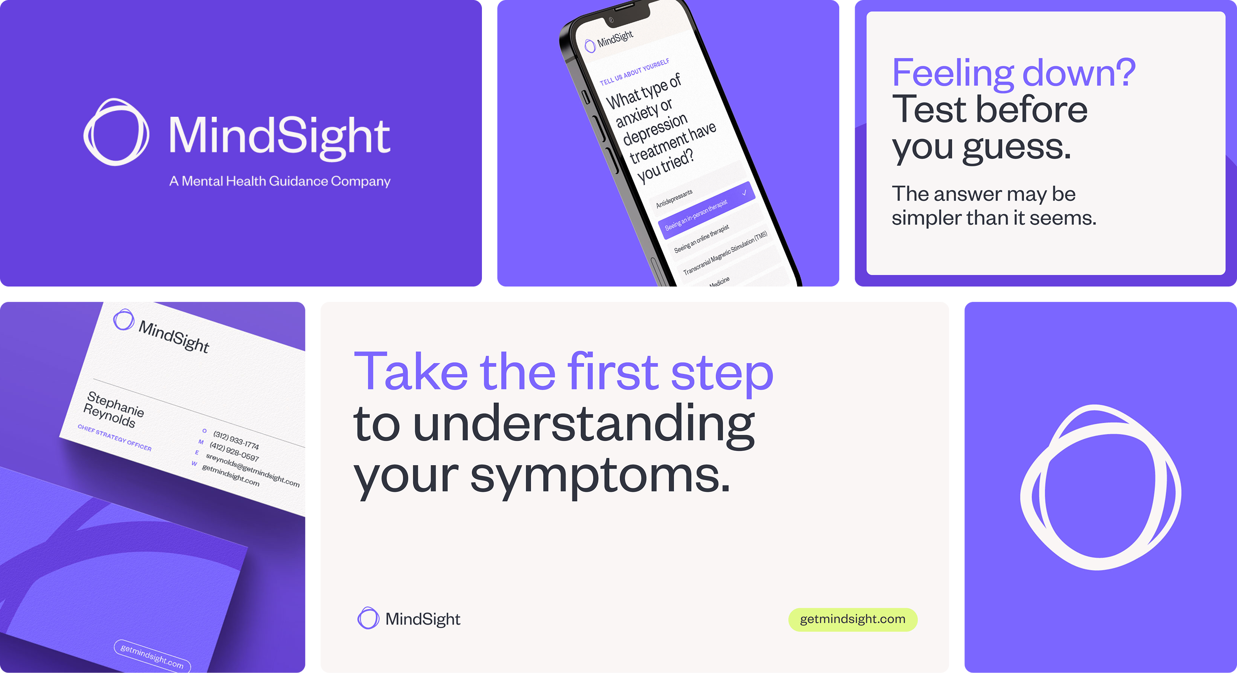 MindSight’s visual presence was built on the idea of precision testing through the lens of guidance. We identified opportunity space in the competitive colorway and strengthened our visual storytelling with a design system built to balance human empathy with scientific authority. For the icon, two hand-drawn circles overlap to evoke the sense of narrowing into focus, or attaining “MindSight.”