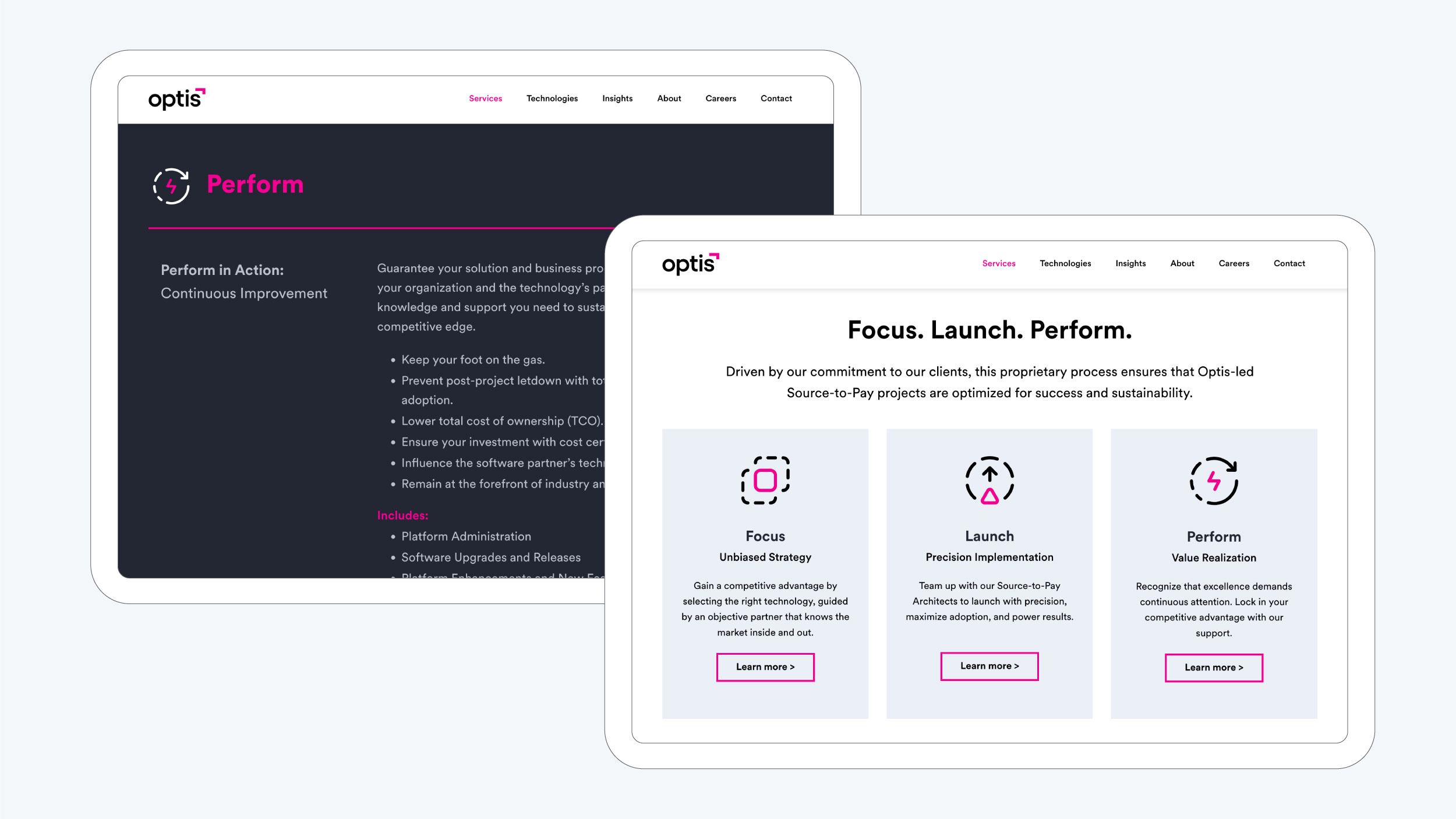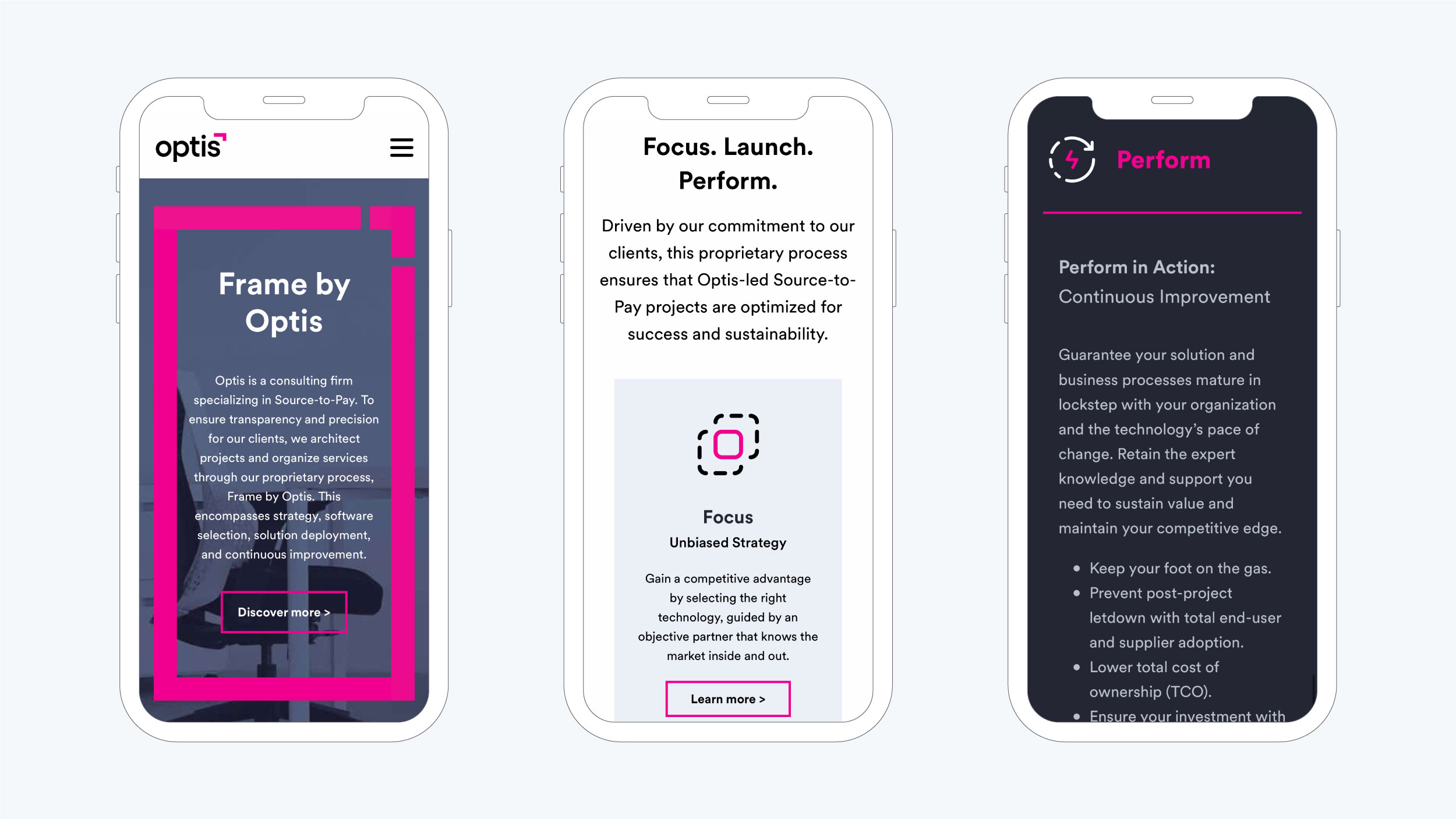 Optis is a source-to-pay consultancy company that competes with big business consultancies, like Accenture, Deloitte and KPMG. Their unique offering is their expertise in source-to-pay advisory and implementation. Our job was to position the business, with its sole focus on supply chain, to communicate the value of their specialized expertise.
